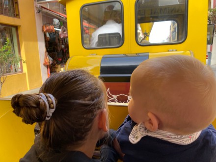 Am Spielplatz ist eine kleine Orca-Achterbahn für Kinder. Unsere Maus ist das erste mal mit 3 Jahren mitgefahren. Je nachdem ob die Kinder Schnelligkeit mögen und keine Angst vor lauten Geräuschen haben, kann man das gut machen. Ich habe auch schon minimal jüngere Kinder gesehen. Es gibt keine Anschnallgurte, sondern nur einen Metallbügel vor dem Bauch. Das muss jeder für sich und sein Kind entscheiden. Juna hat es geliebt. Pro Person kostet eine Fahrt 1€.