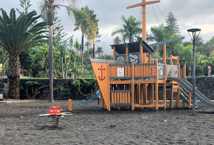 Der erst kürzlich erneuerte Spielplatz ist in Puerto de la Cruz direkt am Strand. Dieser Spielplatz ist ein sehr gepflegter Spielplatz im Stil eines Piratenschiffs. Es gibt schwarzen Sand und verschieden Spielgeräte. Es gibt eine Rutsche, Wippen und viele Möglichkeiten zum Klettern. Kinder ab zwei kommen hier auf jeden Fall auf ihre Kosten. Auch Burgen und Strassen können von jüngeren Kindern im Sand gebaut werden. Für die Begleitung der Kinder und Pausen zum Snacken sind Sitzmöglichkeiten da. Der Spielplatz ist übersichtlich und in einem sehr guten Zustand, da er Ende 2019 erst erneuert wurde.